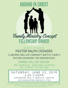 Join us as we celebrate what God is doing to restore families and healthy relationships in our community through discipleship. Our theme is Abiding in Christ. We’ll have testimonies, food, and fun!